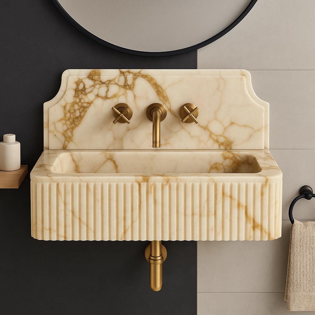 We offer this Calacatta Gold wall-mounted sink as a made-to-order piece, allowing you to customize dimensions, edge profiles, and fixture finishes to suit your space. Each sink is handcrafted from a single block of natural marble, ensuring unique veining and character. Production and delivery times may vary based on size and customization requests—please contact us with your preferred measurements and design details for a personalized quote.