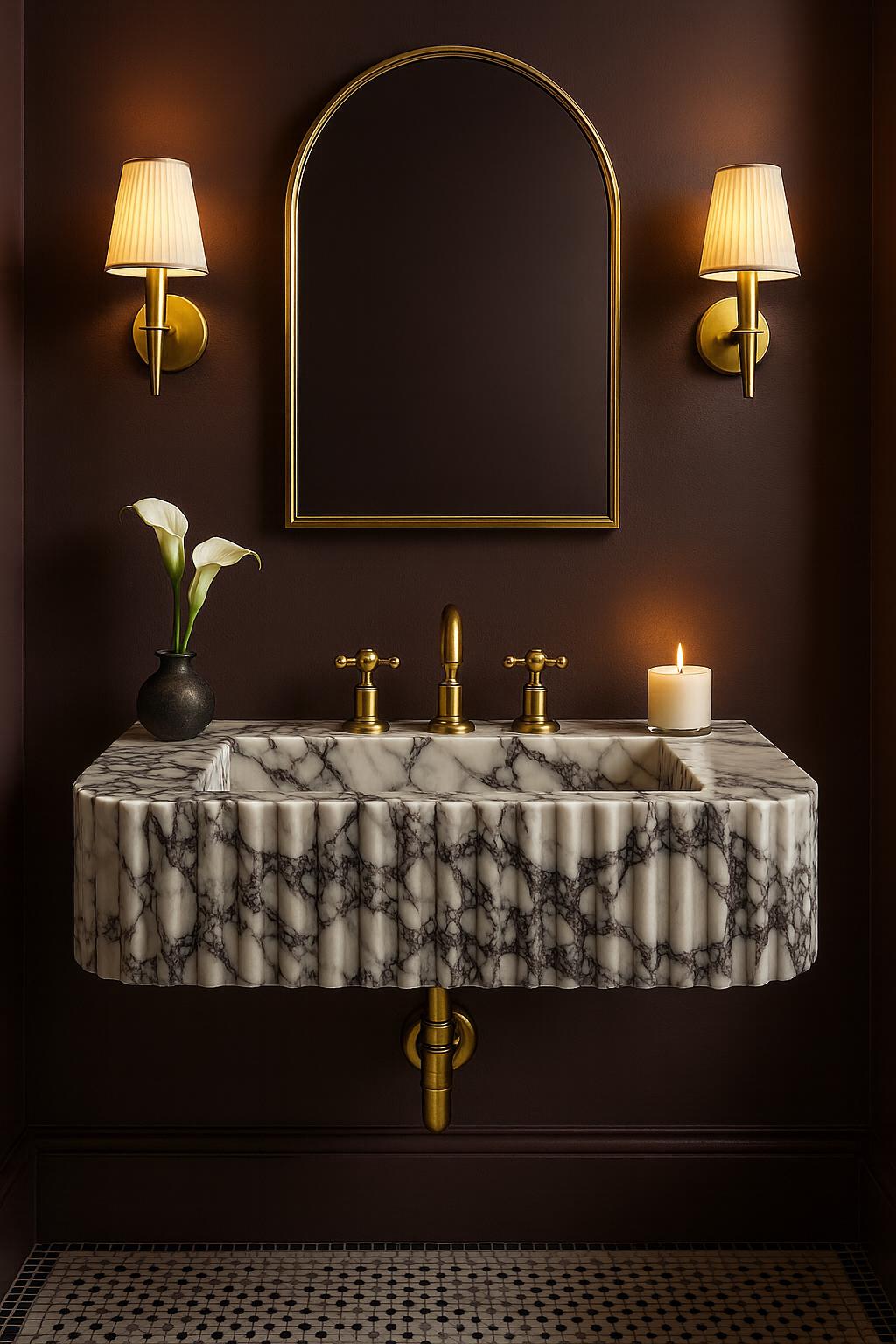 Bring gallery-level stonework to your powder room. Our Calacatta Viola marble sink features a hand-fluted front and a sculpted basin carved from a single block of stone. Each piece is made to order and tailored to your dimensions for a perfect, luxe fit.