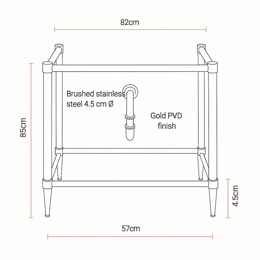 This sink leg set includes both vertical and horizontal support components. Each piece is crafted from 316-grade stainless steel, offering exceptional corrosion resistance, long-term durability, and a refined surface finish. Available in two elegant finishes: brushed stainless steel and gold brass coating.